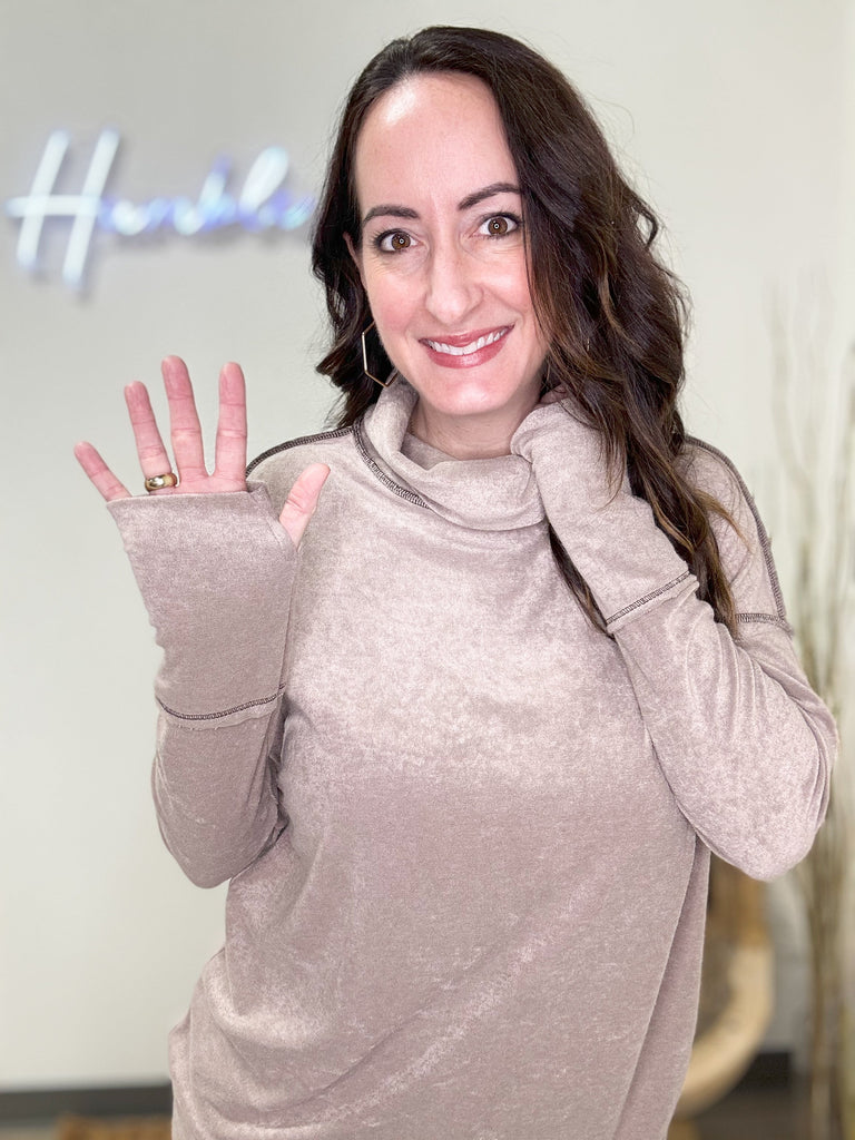 Loop terry knit turtle neck top with thumb open cuffs. Perfect for those cold days and as a layering piece!