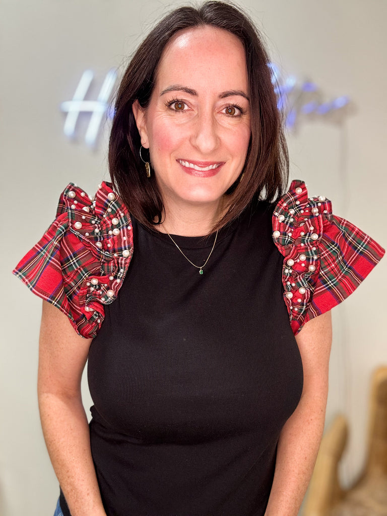 Black Top with Plaid & Pearls Ruffle Sleeves