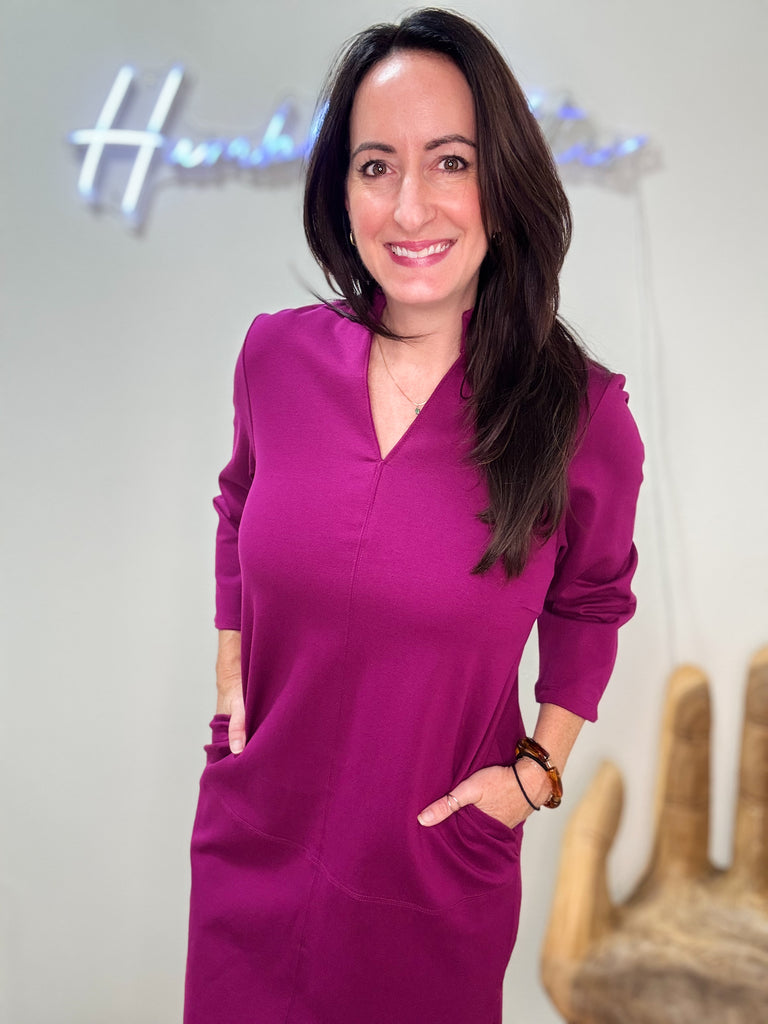 Beautiful merlot colored dress with flowy sleeves and beautiful v-neck, collar, and stitching details. Fits true to size. Amy is in a small.
