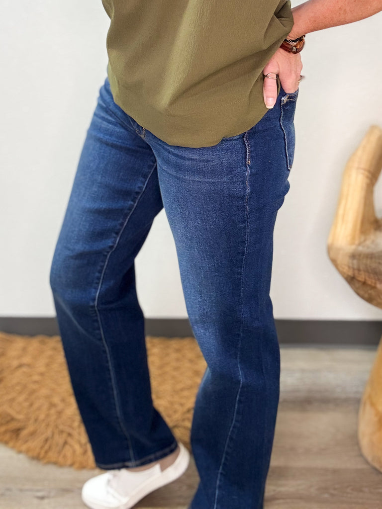 These Judy Blue denim jeans feature a strait fit style, mid-rise waist length, and have a dark wash finish. Along the side of each leg; the hemline gradually moved down the center of the leg. Fits true to size to size.