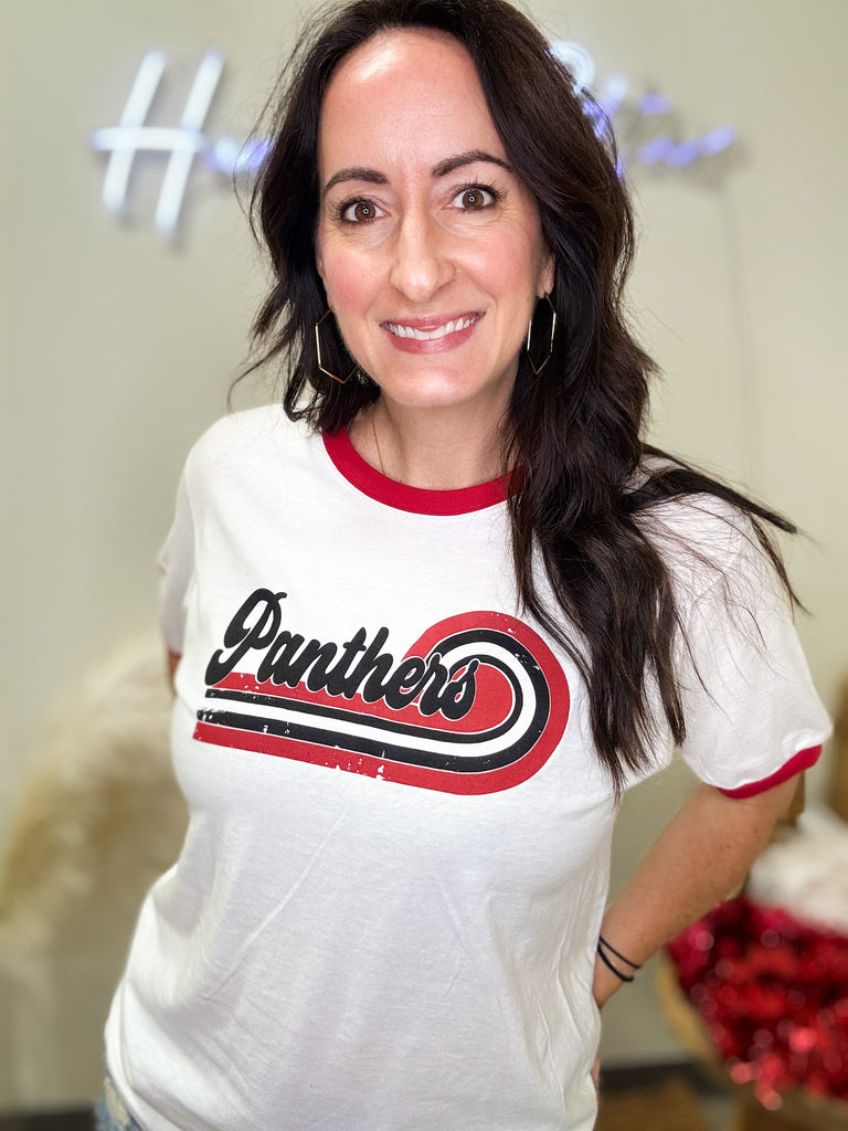 This tee features “Panthers” on the front with a retro vintage swoosh in the Cabot Panther colors! The tee has a red boarder on the neckline and sleeves. The perfect raglan tee! Wear at a ballgame, school, or around town. Go Panthers!