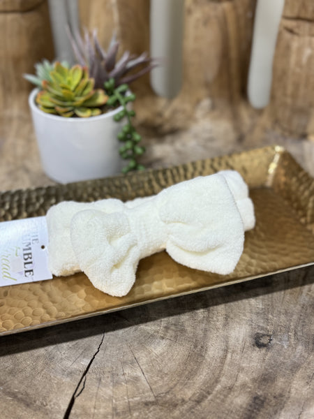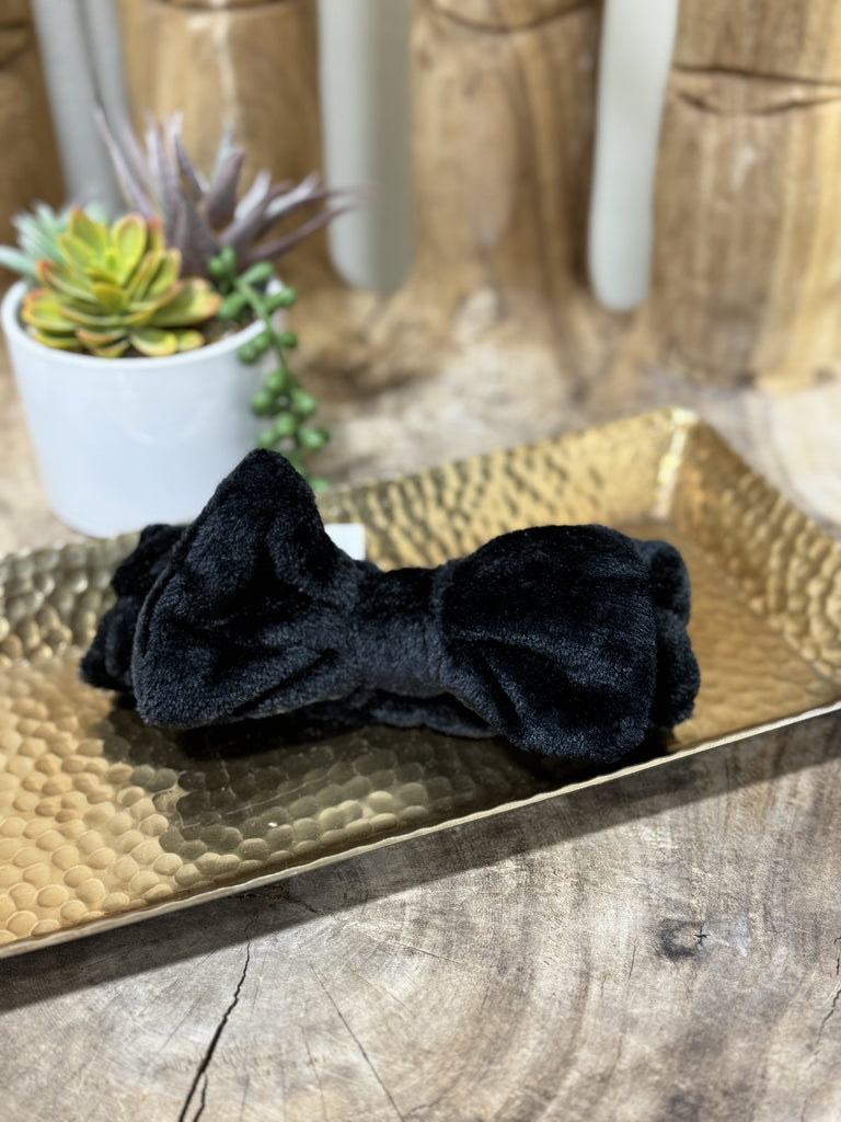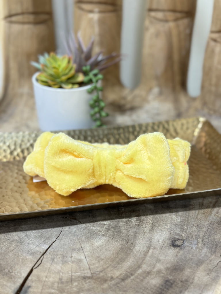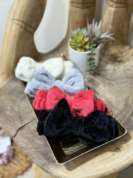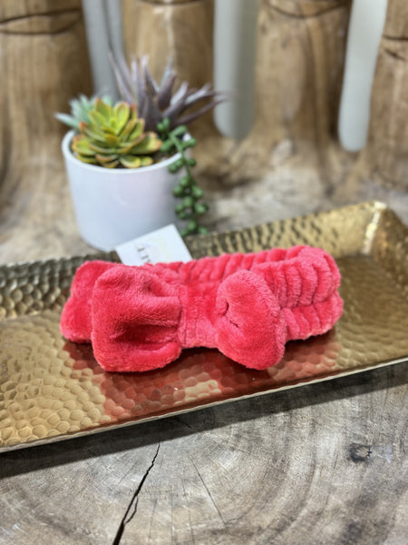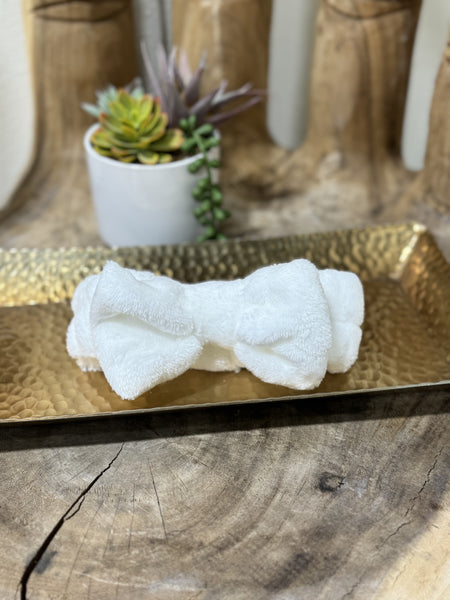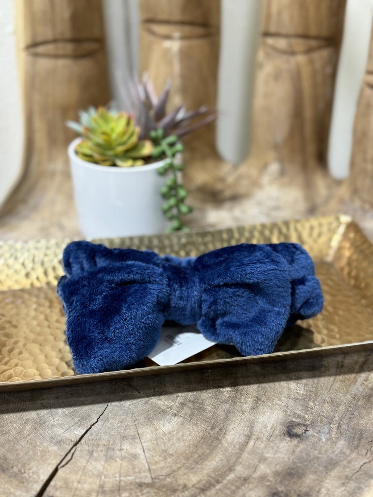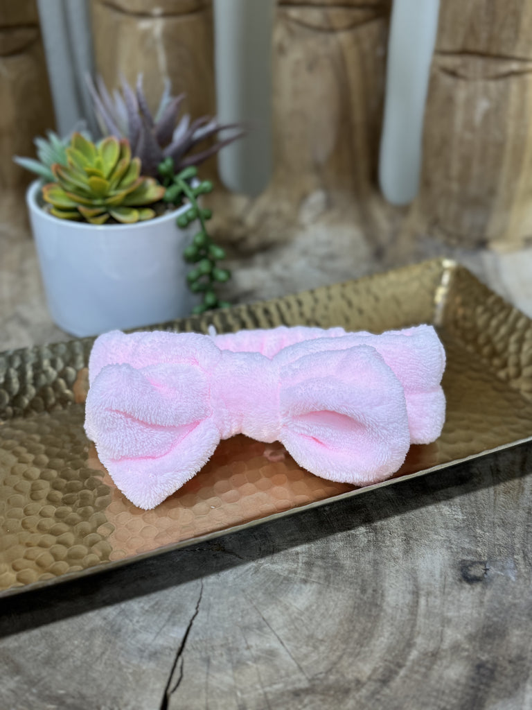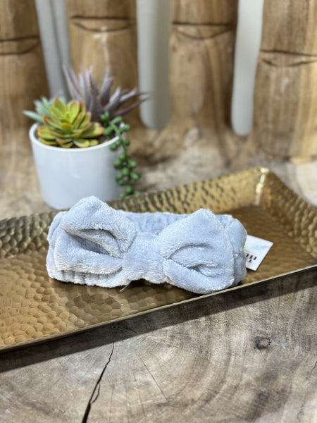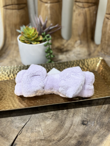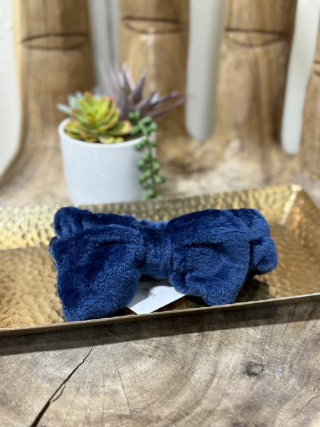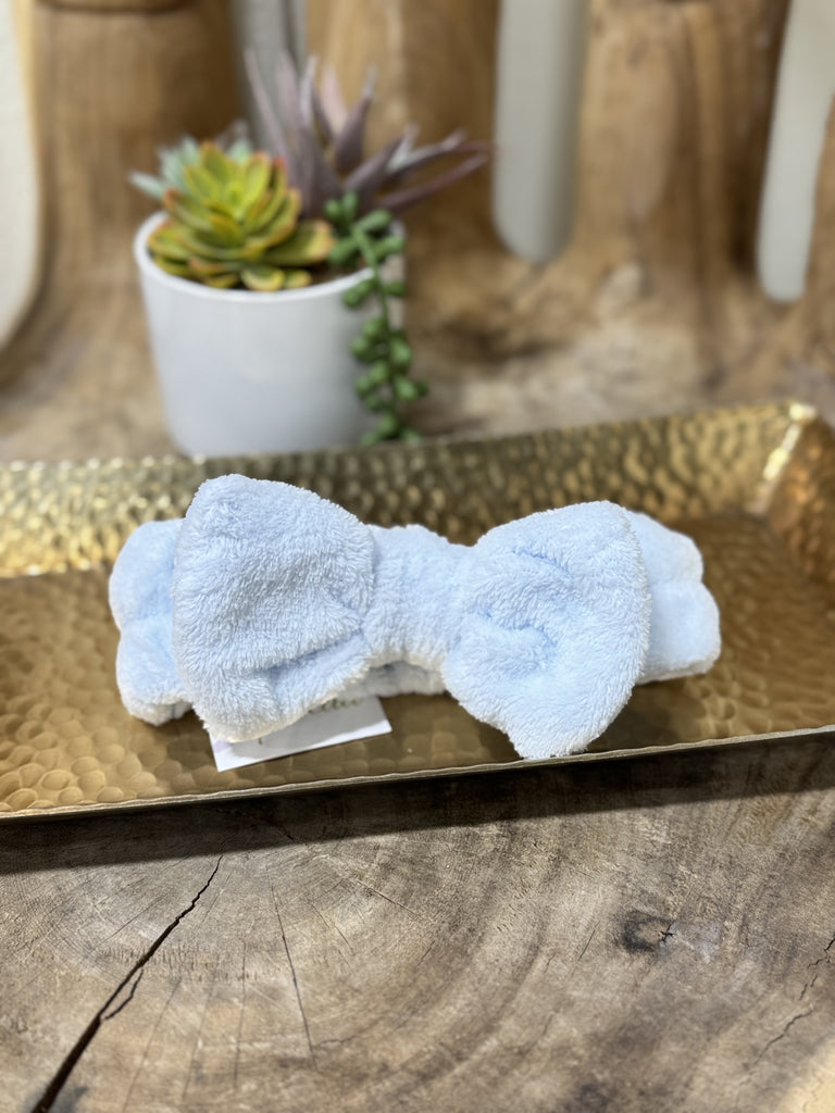Keep your hair pulled back with this plush spa headband! Has knotted bow in the front and stretchy elastic in the back. One size fits most.