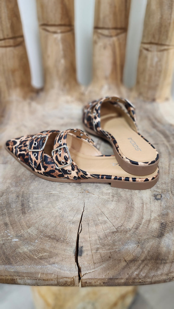 Cheetah print design with a short block heel. They have two wide straps that cross over the top of the heel and a pointed toe.