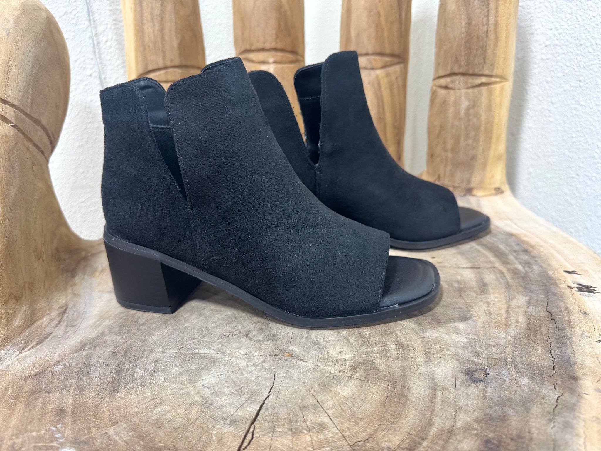 Black boot with a small heal and open toed. The heel makes it function for work wear and the peep-tow makes it perfect for Arkansas fall! Runs true to size