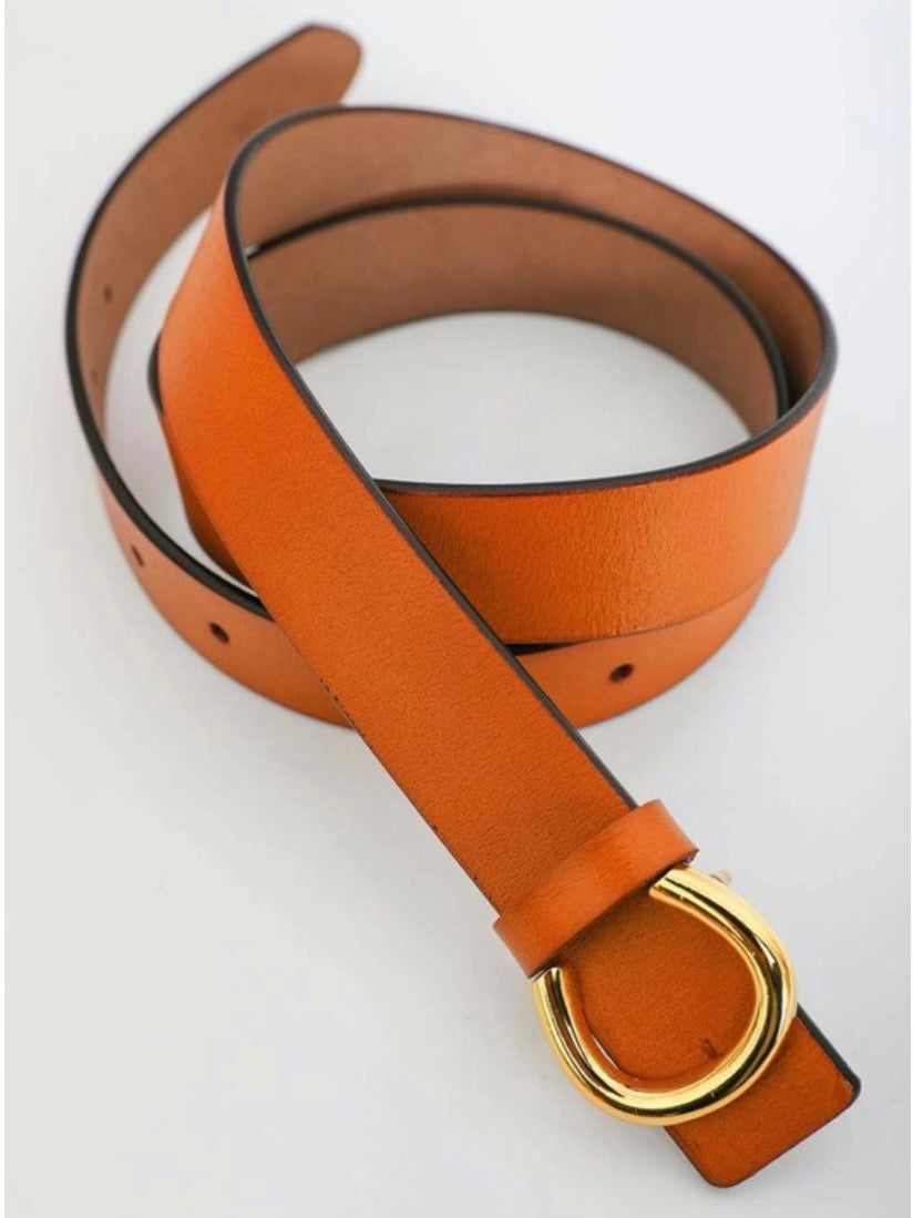 Camel and gold minimalist leather belt. 100% genuine leather. One size fits most. 43” x 2”.