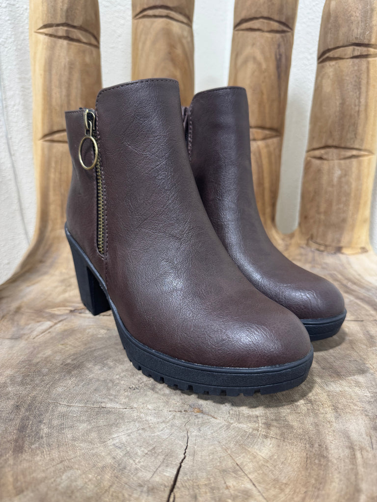 Leather boot with a small black heel and a gold zipper. The heel is 1.5in making it a great all day shoe. Perfect for work or play. Pairs great with your cropped, wide leg, and skinny denim.