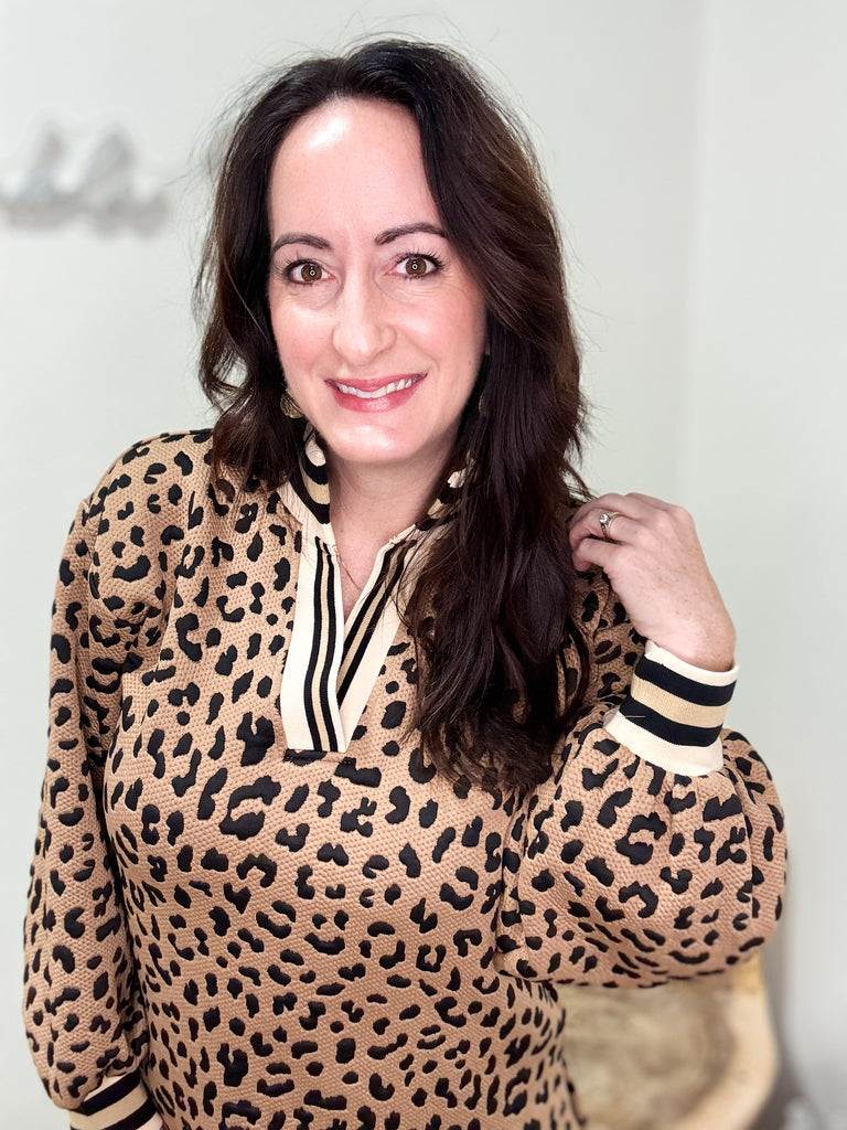 This stunning pullover has a leopard print body and stripe detailing on the collar and sleeve cuffs. The neckline is a v-neck and the sides have a two inch side slit. Fits true to size. Amy is in a small