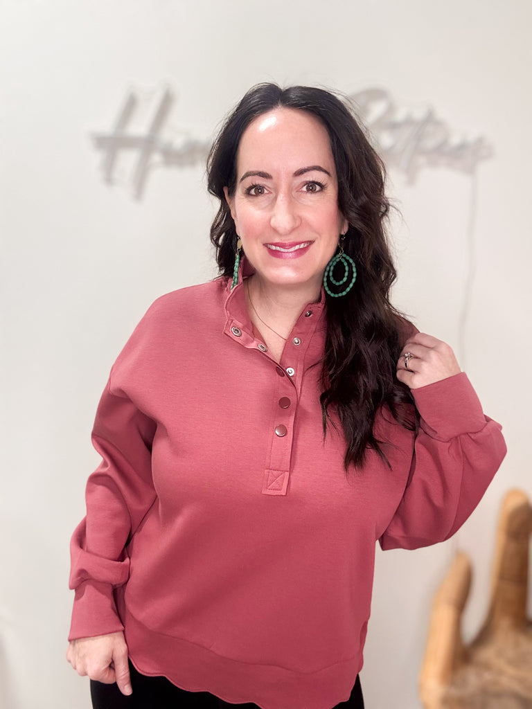 This lovely rosewood colored pullover has a quarter button detail and scalloped hems. Perfect for at home, on the go, or at the gym. Fits true to size. Amy is in a small.